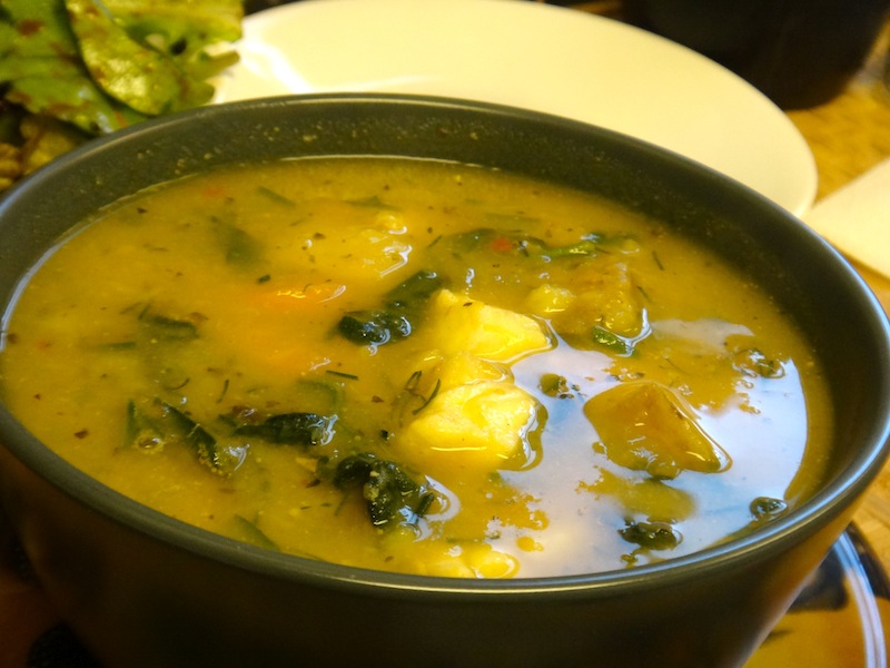 In a large soup pot, add 1-2 T olive oil and heat. Add the onion and sautee, about 7 minutes, until soft and starting to brown. Add the garlic, stir to frangrant (about 30 seconds – 1 minute). Then add the carrots through potatoes, cook another 2 minutes or so. Add the seasonings, stir to coat the veggies and start toasting the seasonings, add some salt and pepper (start with about 1-2 t each), and cover with the broth. Bring to a boil, reduce to a simmer, and cook about 30 minutes.