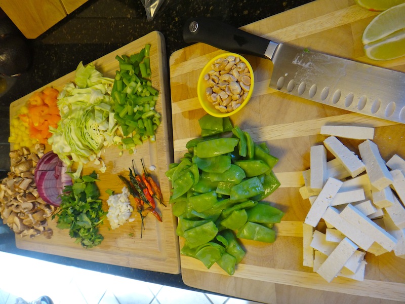 Add a touch more oil to the wok, and add the bell pepper and carrot, sautee about 2 minutes. Add the cabbage and garlic, cook about 1 minute. Drop in the mushrooms and tofu, green onions and cilantro, toss. Add the noodles, then the sauce and toss well. Take off the heat, sprinkle in the peanuts, and serve with a big wedge of lime for extra tang!