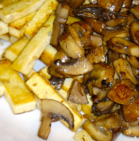 In a large wok, add about 1 T oil. When HOT, add the tofu and toss. Cook until nicely browned on most/all sides. Set aside. Add another 1T oil, then drop in the mushrooms and cook also until cooked and browned. Remove to plate with tofu.
