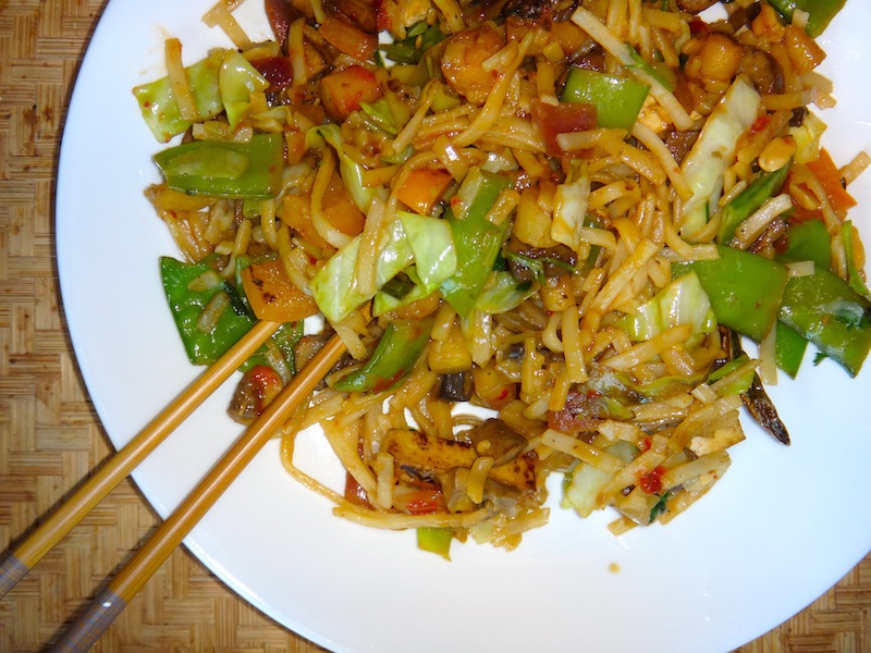 I love Thai food, and this is just my take on a noodles with peanut sauce dish that’s served in most restaurants. It’s a lot of prep, but a good way to use up a bunch of the veggies you have waiting in the fridge. I modify this to do just that- whatever vegetables are there, I toss ’em in! A lot of lee-way here. (This serves about 6 people.)