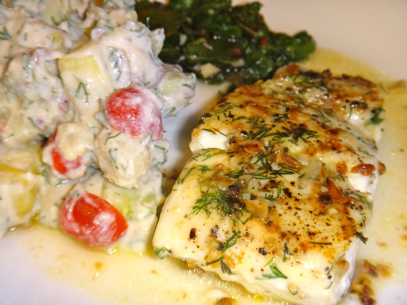 We got a huge batch of dill with our latest CSA box, and I love dill. I usually make things like lemon-garlic-dill chicken or dill potato soup, but this time, I went with fish. As you’ll see, I bias towards halibut; it’s a mild white fish with an inoffensive texture, so it’s great for those of us who are still trying to get into eating fish a lot. It’s pricey, but it’s helped me get better with other fish – so we now do throw in others like opah, black cod, snapper, etc. Hubs M says that this recipe would be even better with salmon, so if you like that – go with it! Salmon is still too much for me.
