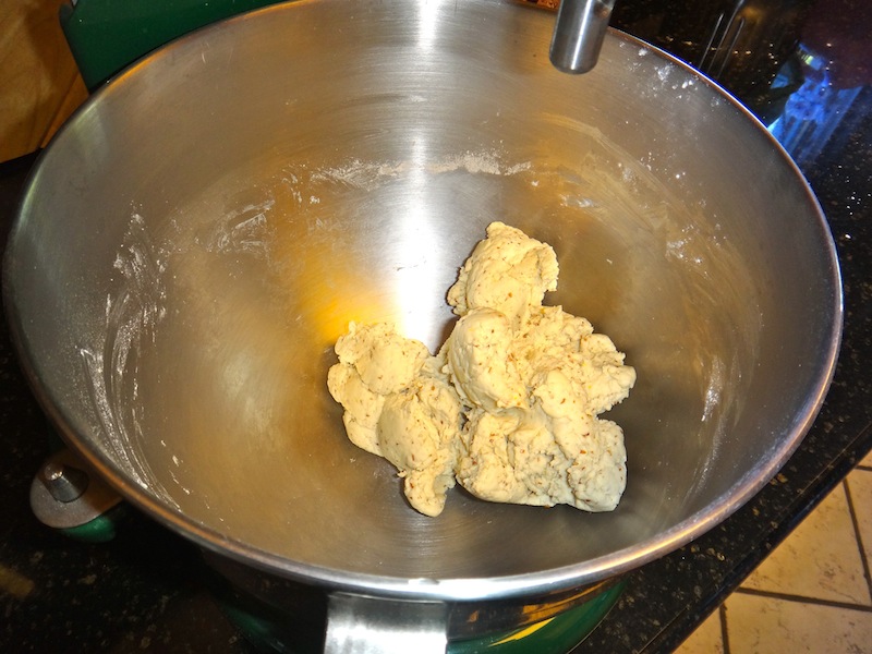 In a stand mixer, add the flour through salt. Mix the flax eggs with the olive oil and add to the flour. Turn the mixer on low with the dough hook. Slowly add the water until it comes together, not sticking to the sides of the bowl but not too crumbly. When it came mostly together I stopped and finished kneading on the counter.