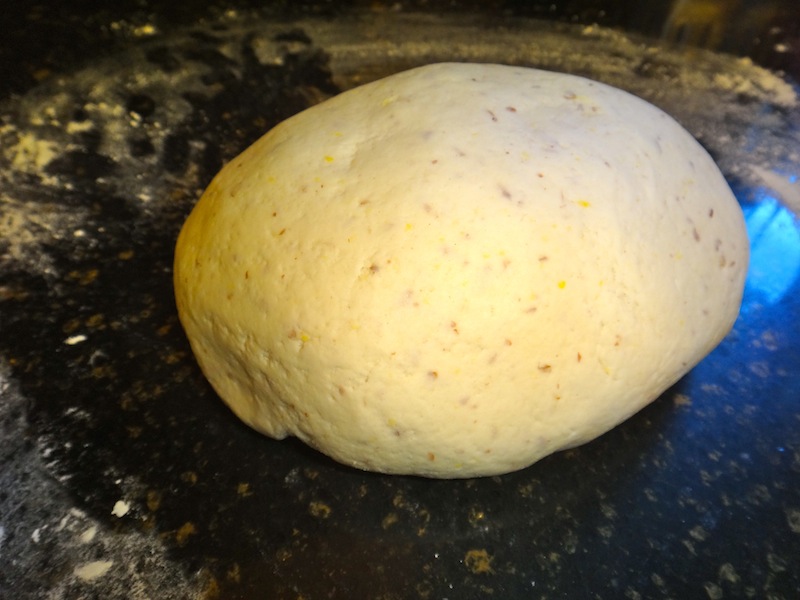 Sprinkle some rice flour on the counter and knead until the dough comes together in a nice, smooth ball. Cut into 4 pieces, smoosh flat-ish, wrap in saran-wrap and let rest in the fridge about 30 minutes. (The specks are from the flax – it helps hold things together AND gives you a boost of healthy stuff like omega-3’s and fiber!)