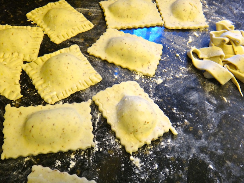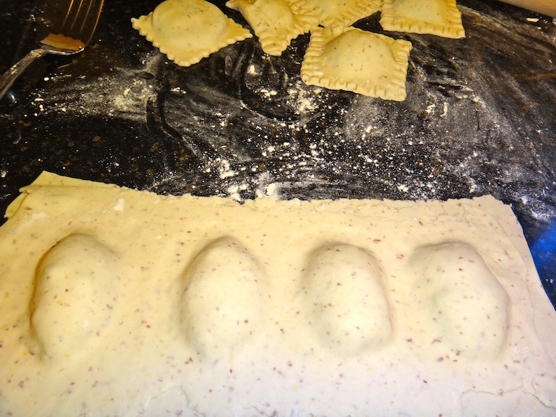 I used a pasta machine to make the sheets of dough, but you could also just use a rolling pin. The pasta machine I kept at the thickest to thickest-1 setting. After rolling the dough, place 1-2 t mounds of filling, top with another sheet of dough, and gently press the dough together around the filling. Take a pizza cutter or knife to cut around the raviolis, and optionally take a fork to add indentions around the sides.