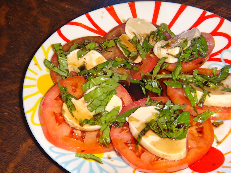 Slice the tomatoes thickly and place on a plate, top with the slices of mozz, and basil. Drizzle with balsamic, a slight bit of extra virgin olive oil, and some fancy salt (like gray salt or fleur de sel), and that’s all you need.