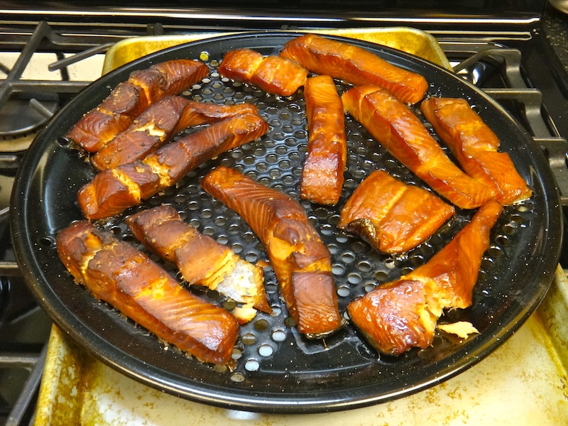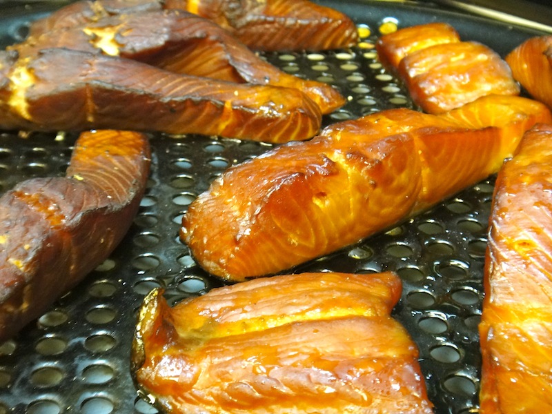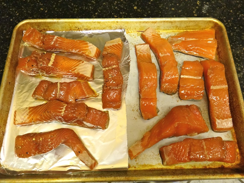 Brine the salmon pieces for 18-24 hours. We put them in a large zippy to do this. Then, remove from the brine and place on a large cookie sheet and put it in the fridge (uncovered, and the pieces not touching each other) to dry out overnight. My fridge has an air filter that I can program to stay on for 24 hours, so I hit that button so everything didn’t end up smelling fishy. After this, the fish should be tacky to the touch.