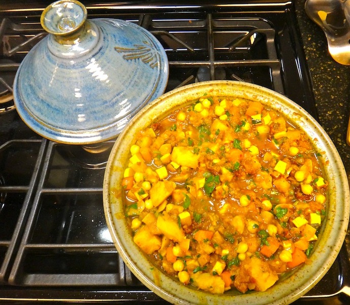 DSC01133In the tagine, heat about 1-2 T oil. When hot, add the onions and cook about 10 minutes, until soft, golden, and starting to brown on the edges. Add the tomato paste through garlic and toast about 1-2 minutes, just to get nice and fragrant. Add the tomatoes through dates, coat in the oniony spice goodness, then add the broth and lemon juice. Bring to boil, reduce to simmer. Cover with the lid and cook for about 30 minutes, until the potatoes and squash are tender. Lastly, add the chickpeas, green beans or peas, parsley, and cilantro, cook a final 5 minutes or so, and then remove from the heat.