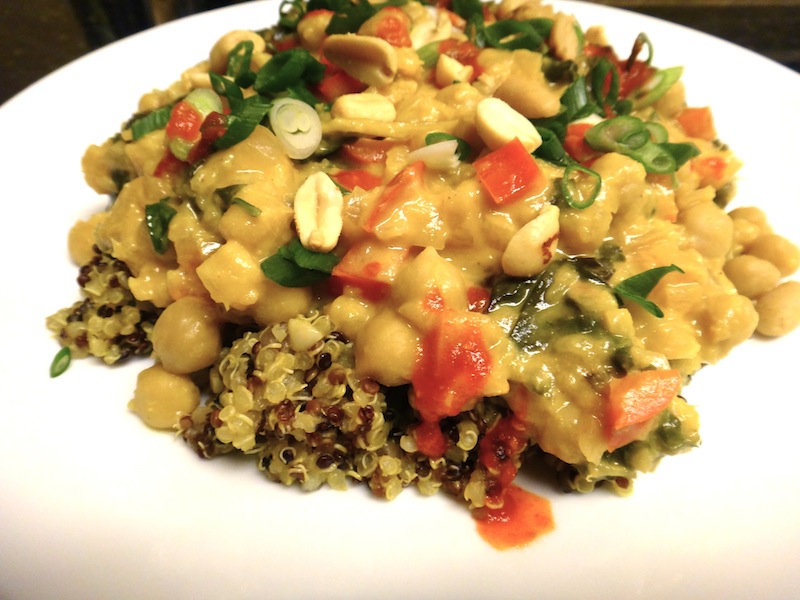 This goes awesome over quinoa (which was recommended by my mom-in-law) – so I highly recommend that (I used the multi-colored quinoa from Trader Joe’s). But if not, this can go over rice, millet, whatever you want! Sprinkle with the chopped peanuts and green onion, serve with some extra hot sauce, and enjoy.