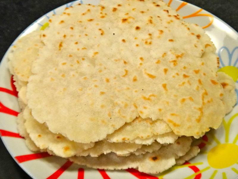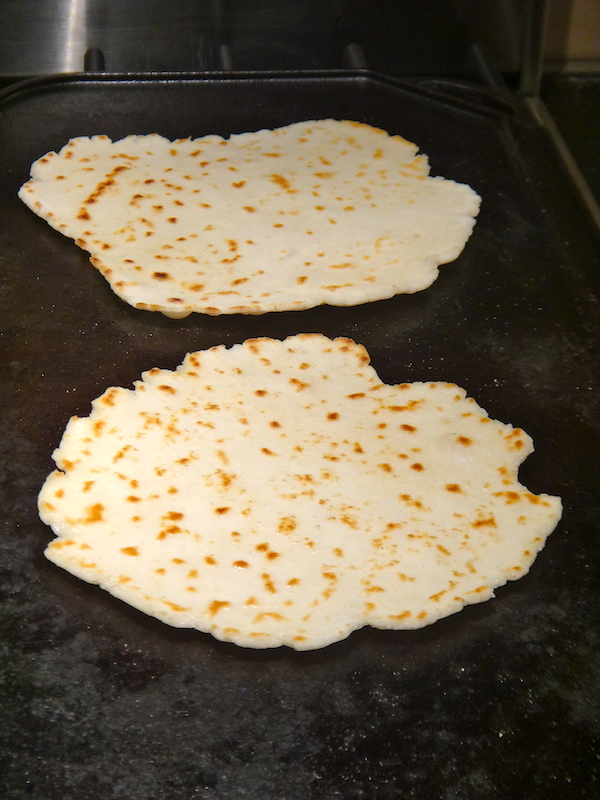 Put the first 4 ingredients in a large bowl and combine (I did so with a pastry cutter to cut in the butter; you could also use a fork or your hands, or even a food processor). Add the water, and stir to form a dough. Knead a few minutes until the dough is smooth (you might need to add more flour if you’re in a moist climate). Roll the dough into a log and cut into about 12-16 pieces (depending on how big you want your tortillas). Take each piece and roll into a ball and then flatten in a tortilla press or with a rolling pin to about 1/8-1/4″ thickness (don’t roll it too thin – it’ll be a cracker).
