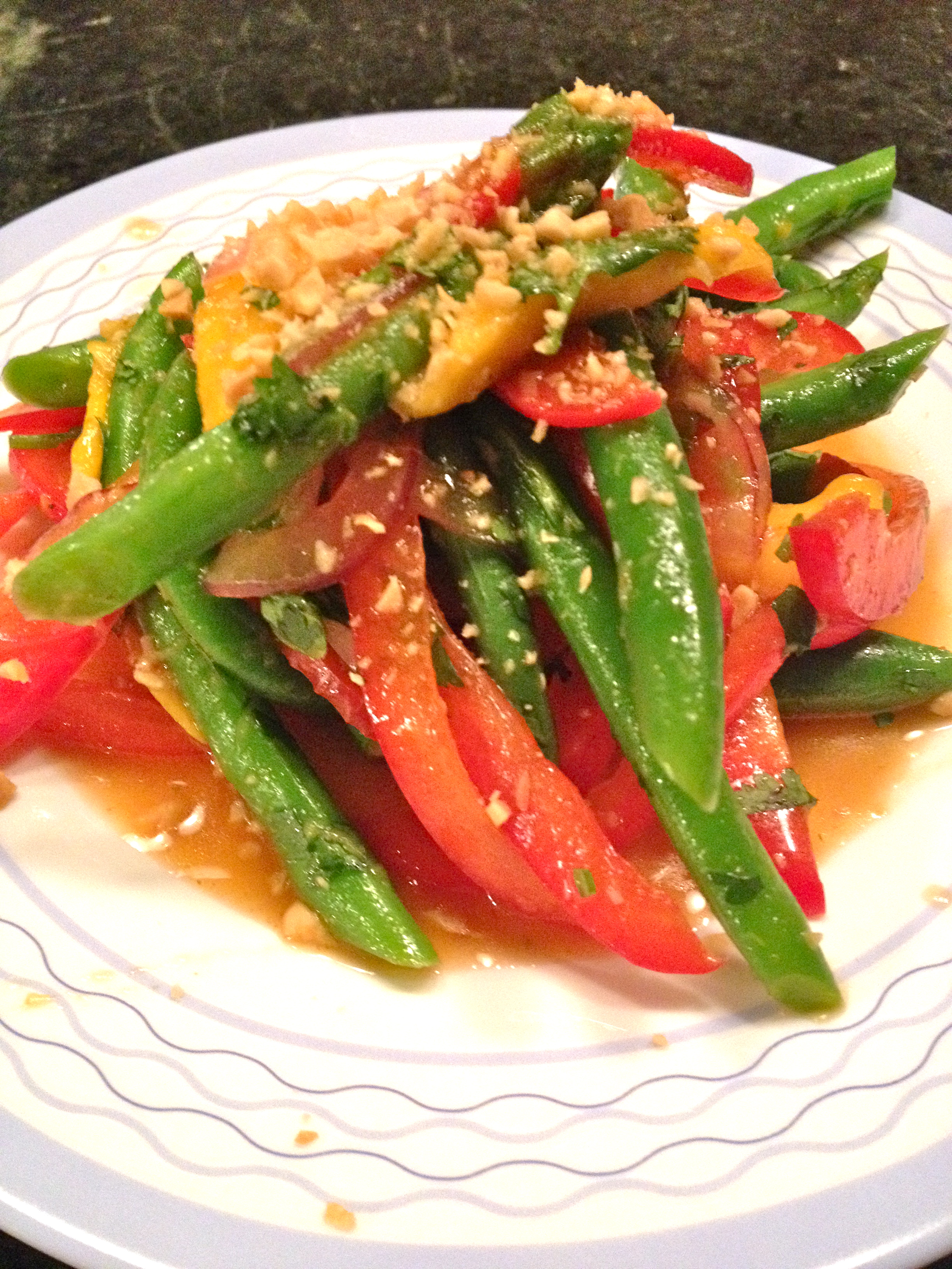 I love Thai food – the flavors of sweet, salty, savory, umami – it just hits all the right places with me. Whenever I find a new recipe, I generally have to try it out pretty quickly. This green bean salad was given to me by my mother in law, and it’s delicious! I’ve made a couple minor modifications to accommodate what I have and what I can’t eat (dairy in one of the ingredients), and I think you will be pleased with the outcome, too.